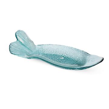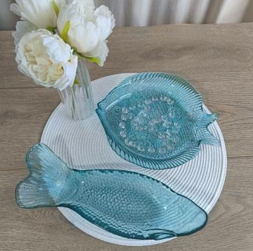 Уявіть собі, що ви подаєте улюблену страву з морепродуктів на тарілці у формі риби – це все одно що принести океан до вашого столу! Тиснене скло блакитного кольору покращує загальне враження від їжі. Подовжена форма надасть кулінарній презентації сучасного вигляду. Чи подаєте ви закуски, основні страви чи десерти, скляна страва «Риба» обов'язково прикрасить сервірування столу.