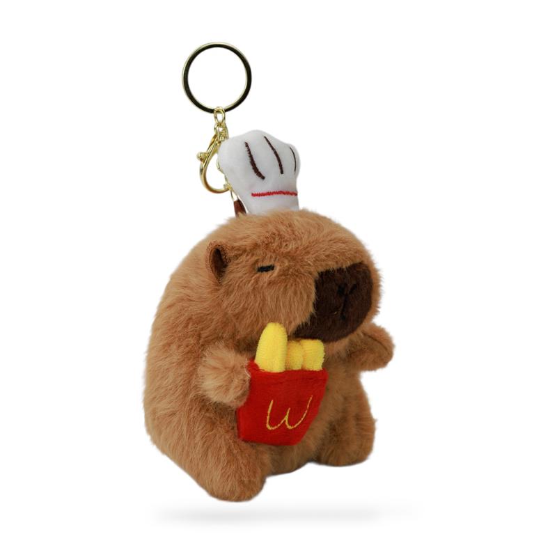 Брелок в виде очаровательной капибары в роли маленького шеф-повара держит любимый всеми перекус — картошку фри. Мягкий плюшевый брелок с шапочкой повара и забавным выражением мордочки поднимет настроение и станет стильным акцентом на ключах, сумке или рюкзаке.