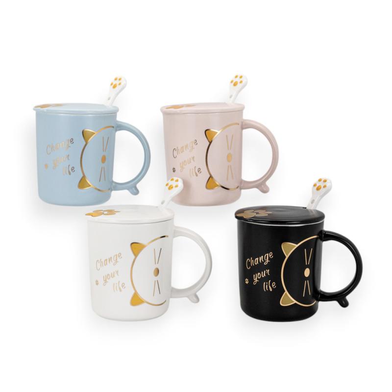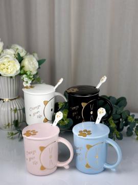 Опис Чашка керамічна з кришкою та ложкою Лапка котика 4 види 370мл