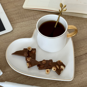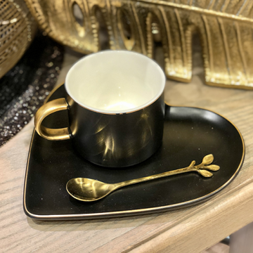 Кавова чашка з золотистою ложечкою прикрашають ритуал раннього пробудження. Гладке блюдце в формі серця служить підставкою, міні-підносом і тарілочкою для подачі солодощів. Позолочена окантовка посуду підкреслює елегантний дизайн. Чіткі форми і витриманий мінімалізм - визнаний еталон смаку.