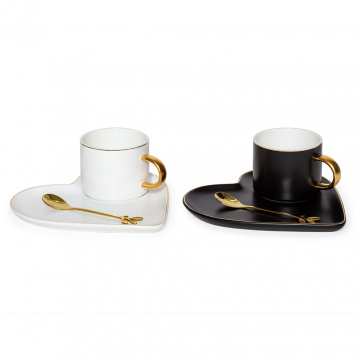 Чашки з блюдцем і ложечкою представлені в двох кольорах: білий і чорний.