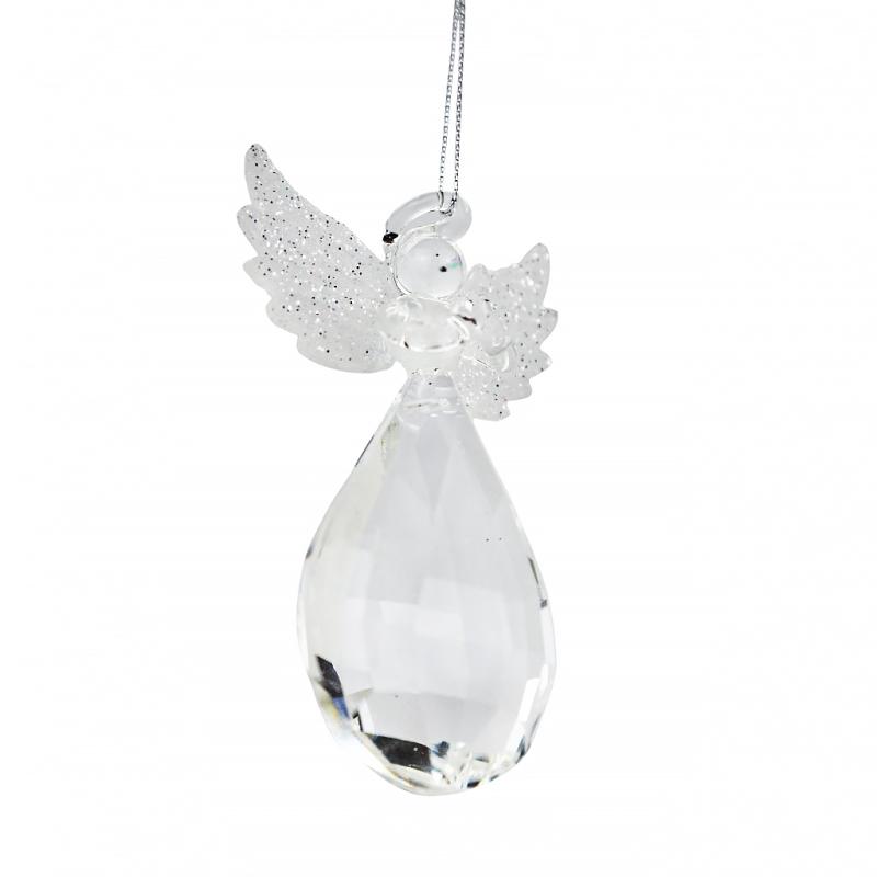 Ангел із кристалом – небесне сяйво на вашій ялинці. Ця ялинкова підвіска у вигляді прозорого ангела з гранованим кристалом у формі краплі немов містить у собі частинку зимового світла. Іскристі крила ангела посипані блискітками, а скляний підвіс виблискує, як замерзла сльоза щастя — чиста, легка і зворушлива.