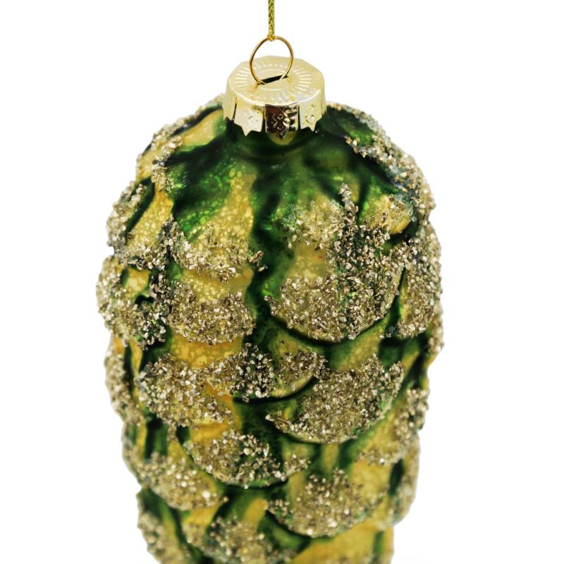 Ялинкова іграшка Шишка зелена - вишуканий акцент для оформлення новорічної ялинки, різдвяного вінка або гірлянди. Глибокий зелений колір і розсип золотистих блискіток створюють ефект інею, немов шишка щойно впала з морозної гілки. Виконана зі скла, новорічна ялинкова іграшка виглядає об'ємно та благородно, а легке мерехтіння підкреслює святкову атмосферу. Відмінно поєднується з кулями в класичній новорічній палітрі - червоними, золотими, білими та бронзовими.