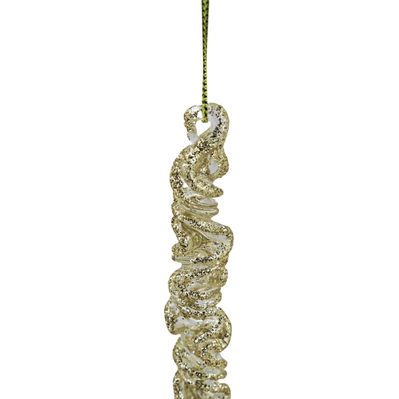 Немов струмінь чарівництва, що застигла в русі, ця скляна кручена бурулька додасть у новорічний декор нотку елегантності та блиску. Золотистий гліттер грає на гранях витончених завитків, створюючи враження, ніби бурулька сплетена із сонячних променів та морозного дихання зими. Незвичайна форма ялинкової підвіски та сяюче покриття перетворюють звичайну гілку ялинки на арт-об'єкт.