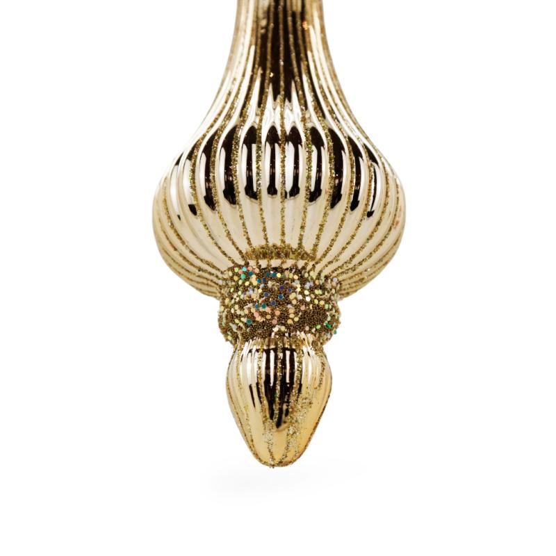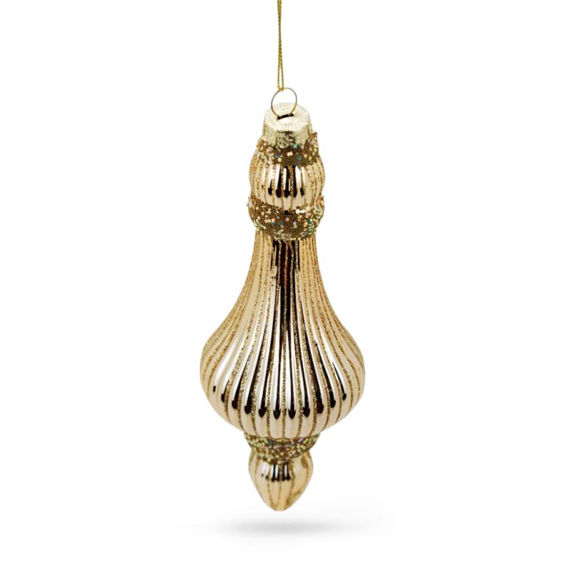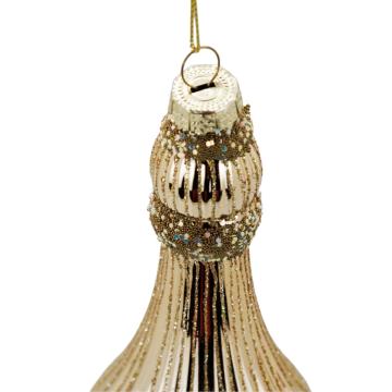 Елегантна ялинкова іграшка "Ліхтар" - втілення класики та витонченого стилю. Колір шампань з металевим відливом та розсип гліттера створюють вишукане сяйво, яке переливається у вогнях гірлянди. Така скляна іграшка на ялинку стане родзинкою новорічного декору та додасть ялинці благородного блиску.