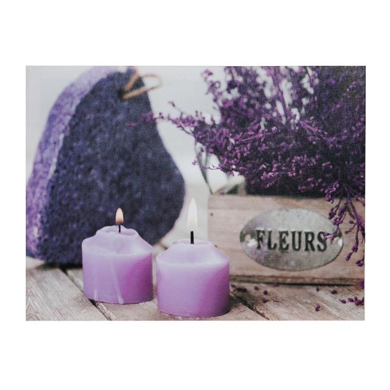 Картина на деревянном каркасе с LED - подсветкой. Отпечатана на художественном холсте. Внутри картины встроено 2 лампочки, подсвечивающие пламя свечи. Питание от 2-х батареек АА