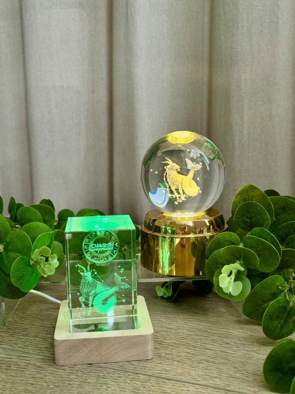 Кришталевий куб з об'ємним зображенням сузір'я Козерога на дерев'яній підставці - це не лише стильний елемент декору, а й оберіг, що відбиває характер цього знака. RGB-підсвічування плавно змінює відтінки, створюючи чарівну гру світла всередині кристала і наповнюючи простір особливим затишком.