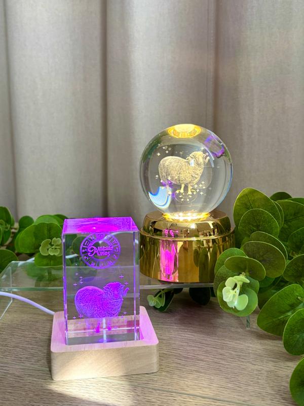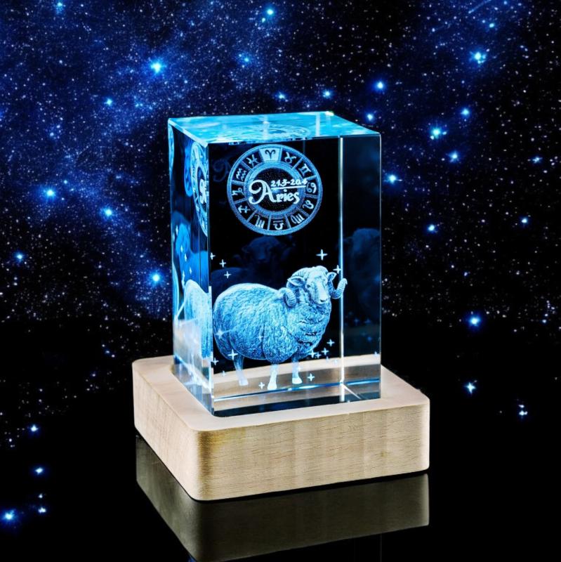 Кришталевий куб з об'ємним зображенням сузір'я Овна на дерев'яній підставці - це не тільки стильний елемент декору, а й оберіг, що відбиває характер цього знака. RGB-підсвічування плавно змінює відтінки, створюючи чарівну гру світла всередині кристала і наповнюючи простір особливим затишком.