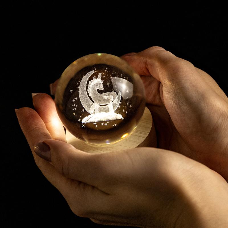 Кришталева куля з підсвічуванням Orion – магія світла у ваших руках! Унікальні лазерні гравіювання всередині скляної сфери створюють глибокий 3D-ефект, а м'яке жовте підсвічування надає затишок і диво вашому простору.