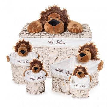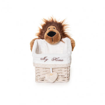 Зовнішній вигляд кошика доповнює кімнату милим затишком. Плетені лоза з бавовняним чохлом має акуратний зовнішній вигляд. Декоративна іграшка Левеня стильно поєднується з інтер'єром дитячої кімнати.