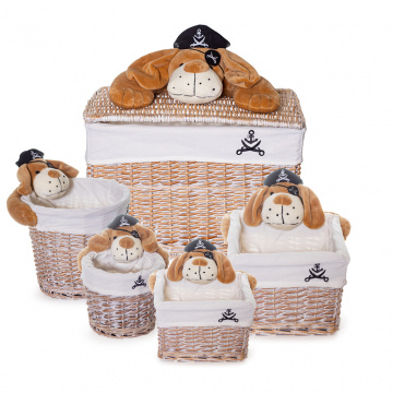 Комплект кошиків «Собака-пірат» складається з моделей великих і маленьких розмірів: XL, L, M, S, XS. На вибір для хлопчиків і дівчаток представлені кошика з персонажами: єдиноріг, бегемот, левеня, зайка.