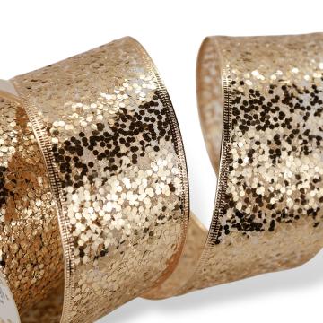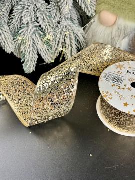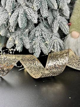 Розкішна новорічна стрічка золотого кольору із витонченим мерехтінням стане незамінним елементом для створення святкової атмосфери у вашому будинку. Ажурна структура стрічки прикрашена дрібними блискітками, які ефектно відбивають світло, додаючи чаклунства будь-якому декору.