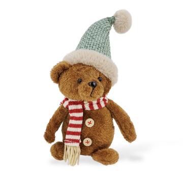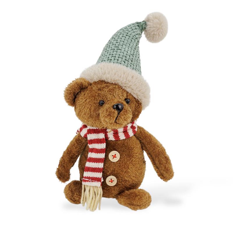 Медвежонок в уютном вязаном колпаке с помпоном и полосатом шарфике выглядит дружелюбно и по-зимнему нарядно. Аккуратные детали — декоративные пуговки, мягкая текстура и новогодние оттенки — делают его стильным акцентом для праздничного интерьера.