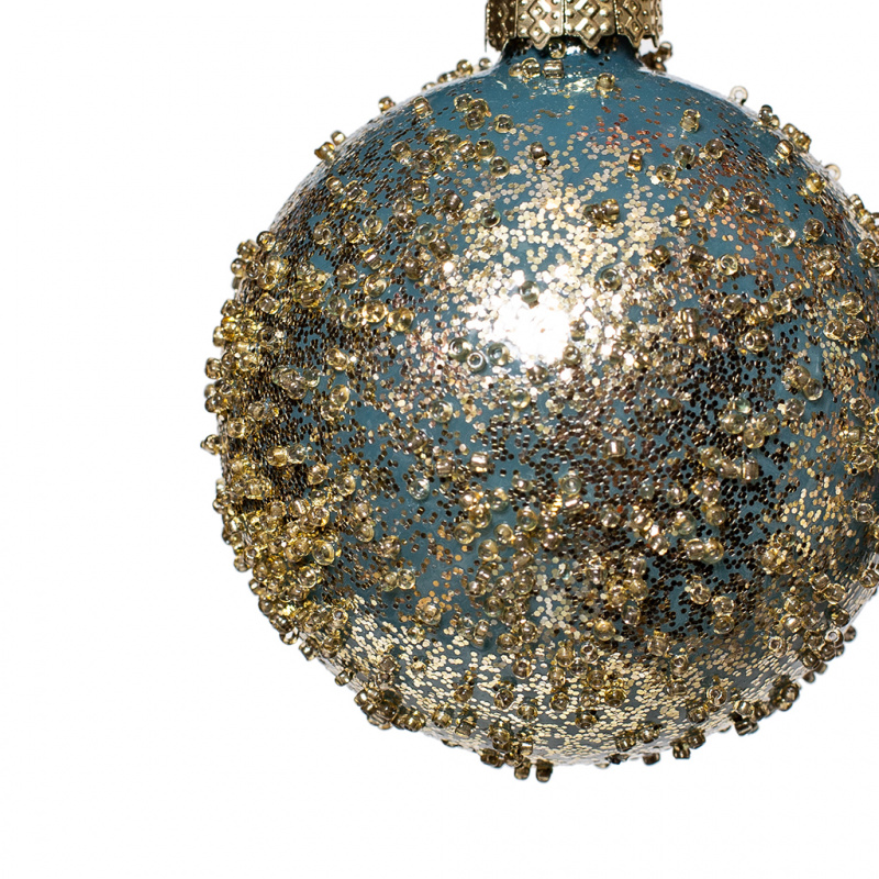 Ялинкова прикраса нагадує дорогоцінний виріб. Бісер і блискітки дають ефектне мерехтіння на ялинці. Ошатний бірюзовий колір поєднується із зеленню гілок. Новорічна куля доповнює собою красу гірлянди, оформлення вітрин і святкових приміщень.