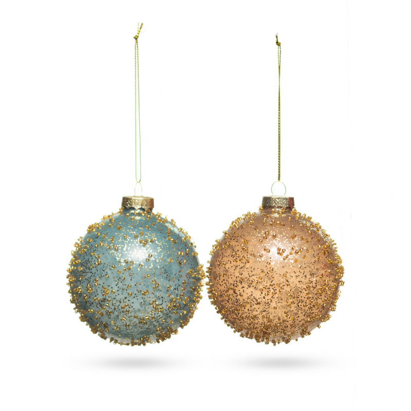 Ялинкові кулі з бісером володіють презентабельним зовнішнім виглядом. Колірна гамма складається з золотого, бірюзового і рожевих відтінків. Моделі куль гармонійно виглядають в одному тріо.