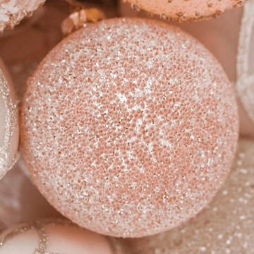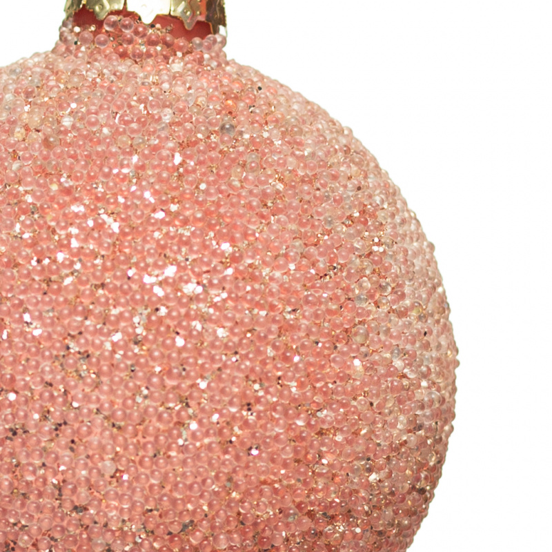 Намистинки на кольоровій кулі виділяються текстурою оксамиту. Міріади блиску переливаються з кораловим відтінком. Новорічна ялинка в оксамитовому склі засяє розкішшю дорого вбрання. Ялинкова куля виділяється на тлі гірлянд і святкових вітрин.