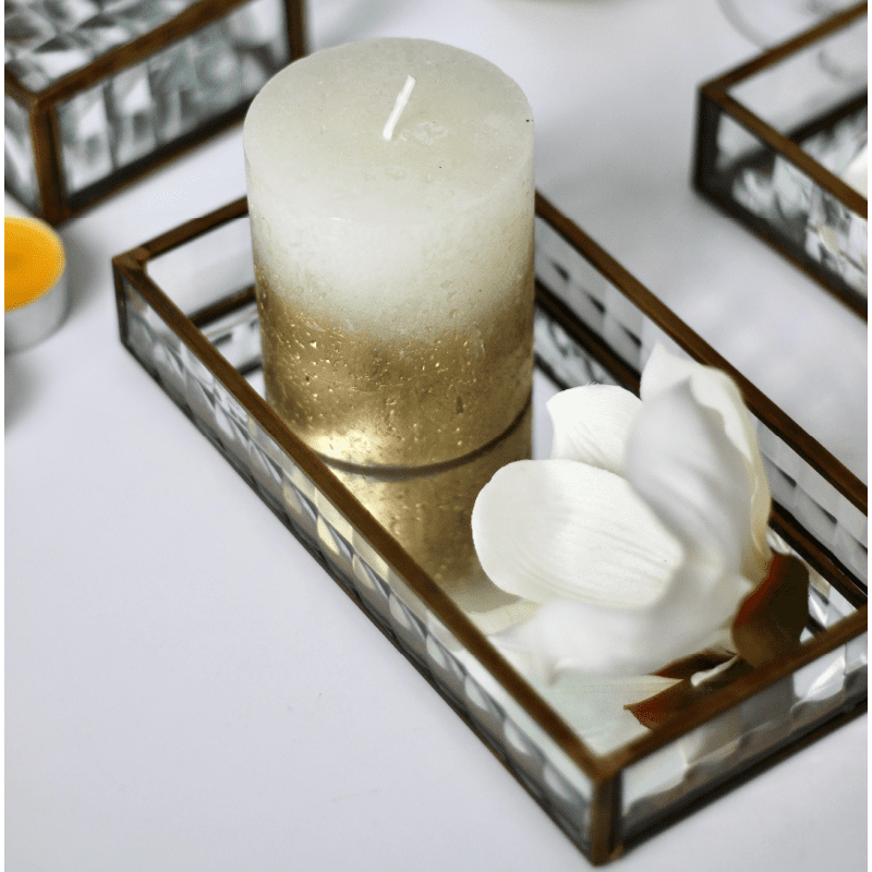 Дзеркальне дно та золота рама привабливі для жіночого інтер'єру кімнати. Міні-піднос ставлять у центр столу як підставку для свічок, вази з квітами або скляних скриньок.