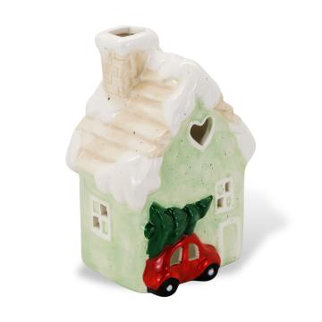 Опис Свічник декоративний кераміка Будиночок із машинкою зелений 16,4х9,3х12см