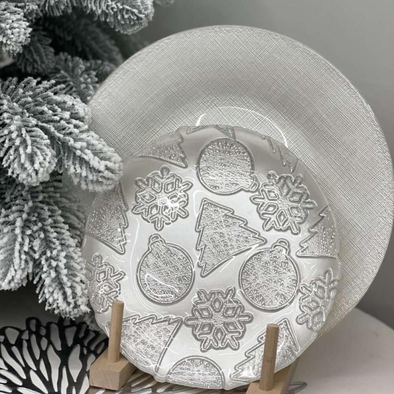 Тарілка скляна Glitter біла зі срібним малюнком 21см