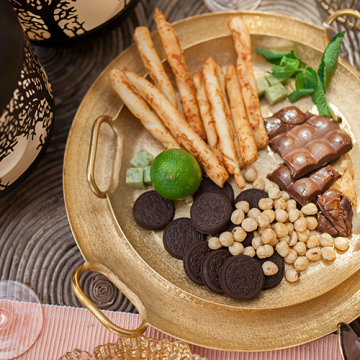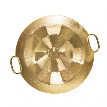 Як проявити гостинність і гостинність в своєму будинку? На золотом таці піднесіть фруктові плоди: груші, яблука, банани і виноград. Просте частування на круглому блюді з металу привертає в будинок благополуччя. Позолота виділяється акцентом на тлі стриманою меблів. Завдяки практичним ручкам, на підносі безпечно переносити склянки, чашки та інші аксесуари сервірування. З двох сторін блюдо прикрашено візерунками ручної обробки.
