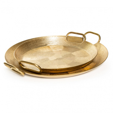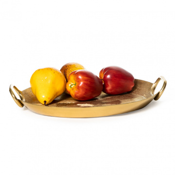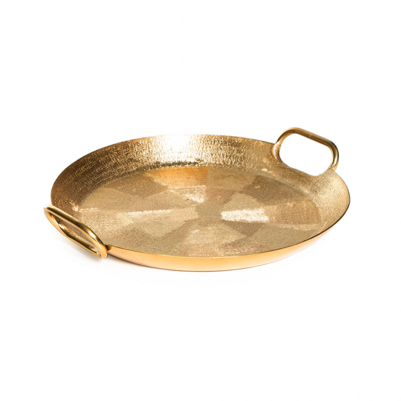 Як проявити гостинність і гостинність в своєму будинку? На золотом таці піднесіть фруктові плоди: груші, яблука, банани і виноград. Просте частування на круглому блюді з металу привертає в будинок благополуччя. Позолота виділяється акцентом на тлі стриманою меблів. Завдяки практичним ручкам, на підносі безпечно переносити склянки, чашки та інші аксесуари сервірування. З двох сторін блюдо прикрашено візерунками ручної обробки.