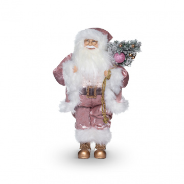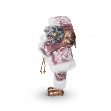 Ошатний костюм нашого героя пошитий не за класичними канонами. Рожевий велюр з відливом демонструє красу і стиль Санта Клауса. Елементи одягу оздоблені по краях білосніжною хутряний оборкою. Наряд оздоблений ручною вишивкою з блискучих ниток і пайеток. Витончено підкреслить пояс з позолоченою пряжкою. Міміка і риси обличчя детально опрацьовані в художньому стилі. Образ Санта Клауса доповнює новорічна ялинка в руці.
