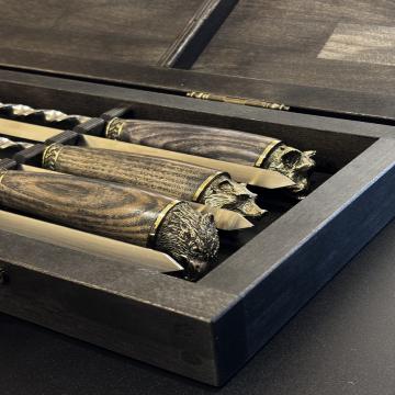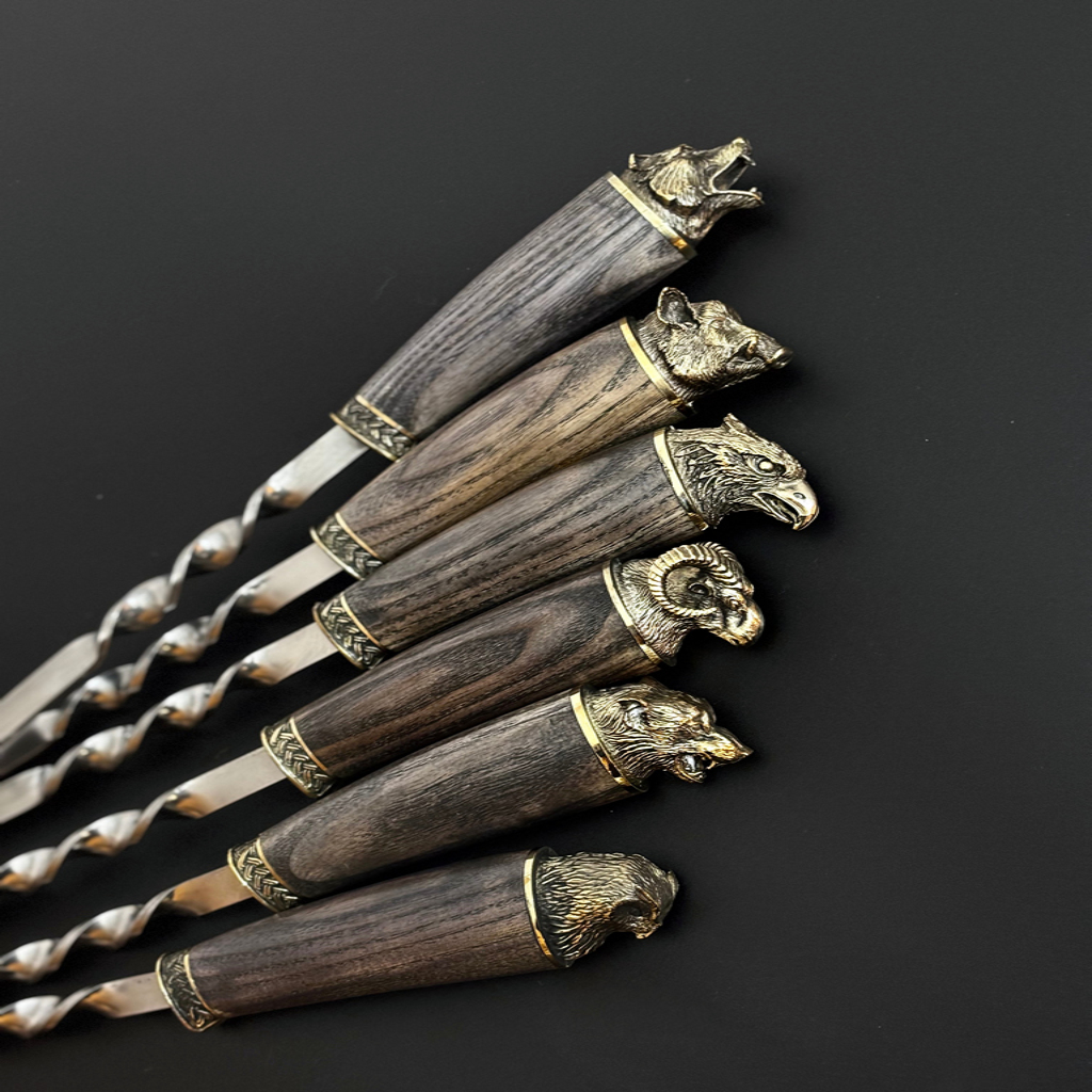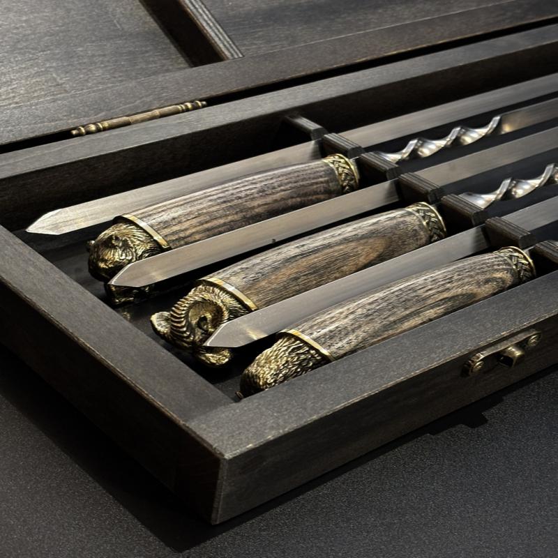Шампури "Полювання" в буковому кейсі - це справжній витвір мистецтва, що відображає силу природи і дух мисливця. Рукоятка шампурів прикрашені об'ємними головами диких тварин - ведмедя, вовка, кабана, барана. Всі елементи шампурів - ручна робота, виконана з високою деталізацією та повагою до мисливських традицій.