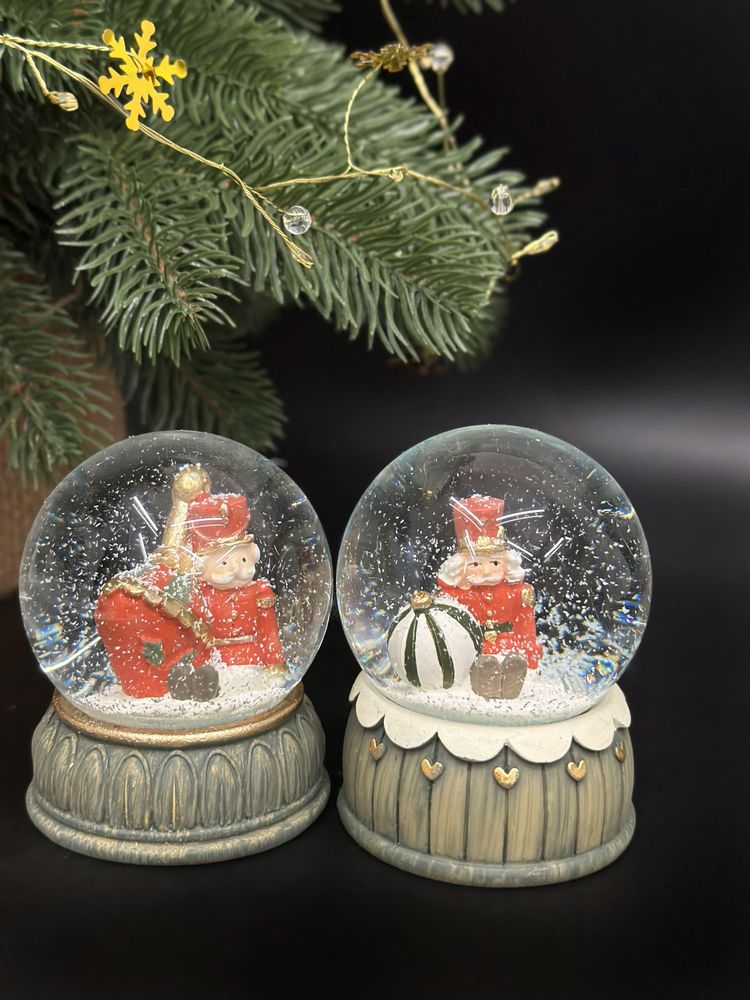 Мініатюрна снігова куля з фігуркою Лускунчика – це символ зимової казки, що втілює святковий дух. Снігова куля, виконана з прозорого скла, наповнена блискучими сніжинками, які повільно опускаються на фігурку Лускунчика, створюючи атмосферу чарівництва та свята.