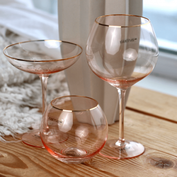 Попелясто-рожеві келихи без ніжки - необхідний елемент сервірування. Посуд універсальний для подачі охолоджених напоїв з льодом: віскі, фруктова сангрія, лимонади з м'ятою, тропічні соки, ягідні морси і мінеральна вода. Келих з золотавим ободком виділяє красу і смак інгредієнтів. У посуді є родзинка стилю для прикраси святкового торжества.