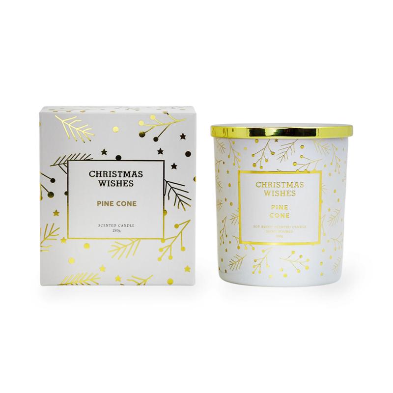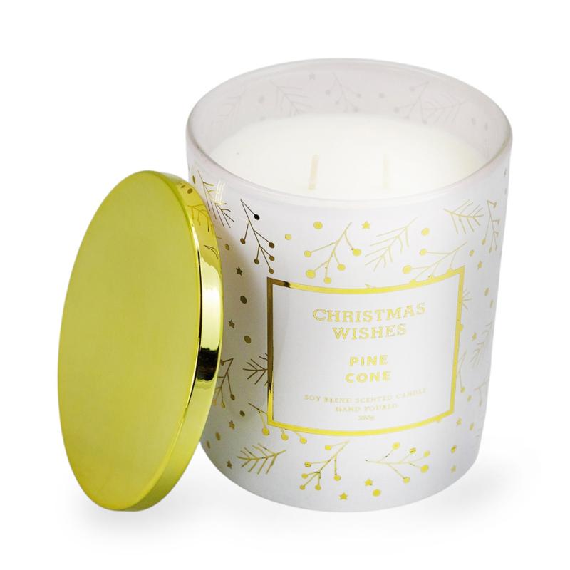 Опис Свічка у скляному свічнику Pine cone біла із золотою кришкою 280г