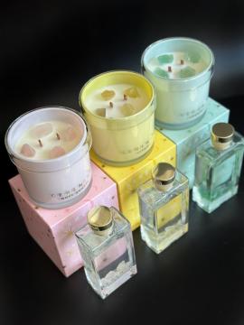 Свічка має два дерев'яні гноти, які при горінні створюють затишне потріскування, наповнюючи приміщення атмосферою затишку та комфорту. Основною окрасою свічки є кристали цитрину, відомого своїми потужними енергетичними властивостями.