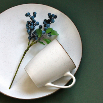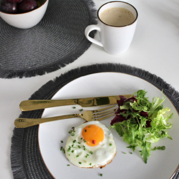 Посуд серії La Rosee Noir виготовлена з кам'яної кераміки високої щільності. Кожен виріб покрито унікальним малюнком крапельок прозорої глазурі і золотистою окантовкою. Тарілка витримує перепади температури і призначена для мікрохвильової печі, морозильної камери, посудомийної машини.
