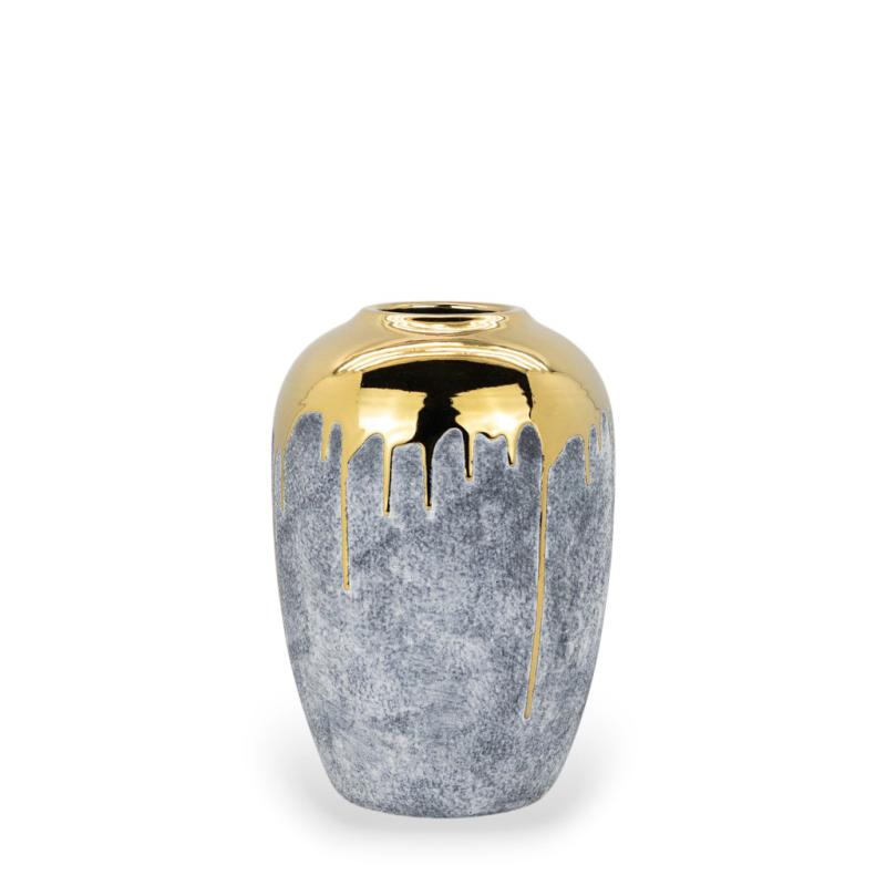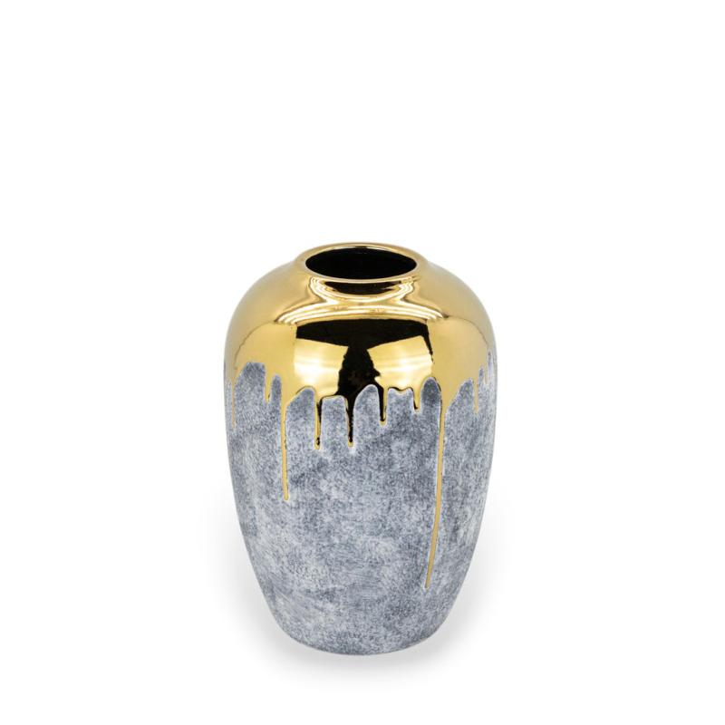 Golden Edge — интерьерная керамическая ваза с выразительным сочетанием фактур и оттенков. Матовая серая основа и эффектный золотистый верх создают красивый контраст, благодаря которому ваза выглядит стильно, современно и заметно в интерьере. Такая декоративная ваза легко становится акцентом в пространстве и добавляет обстановке больше глубины, характера и элегантности.