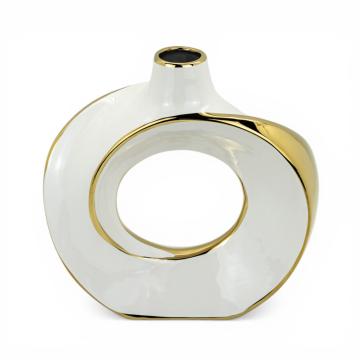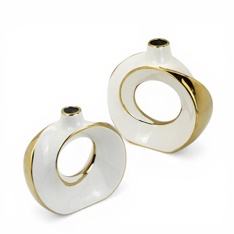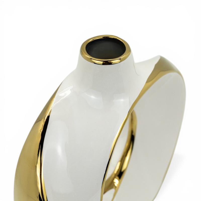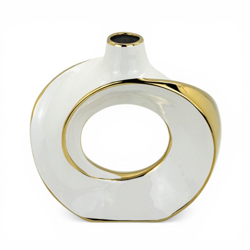 Незвичайна форма керамічної вази Halo одразу робить її помітною деталлю інтер'єру. Круглий силует з центральним отвором виглядає сучасно та виразно, а поєднання білої кераміки з тонкою золотою окантовкою надає керамічній вазі елегантності та акуратного декоративного акценту.