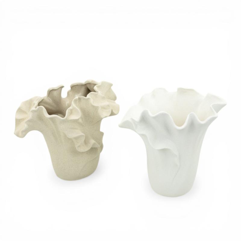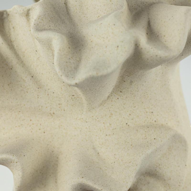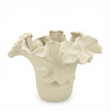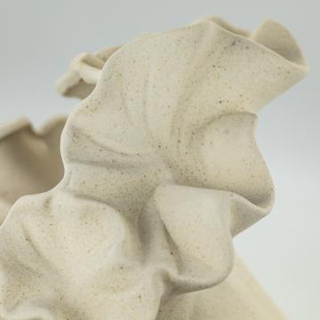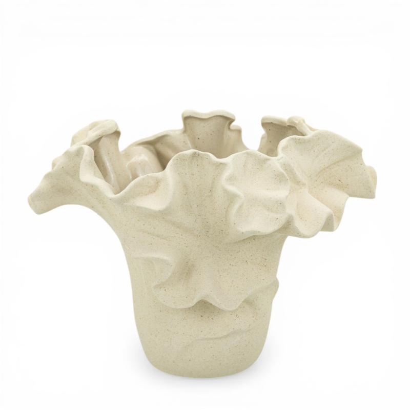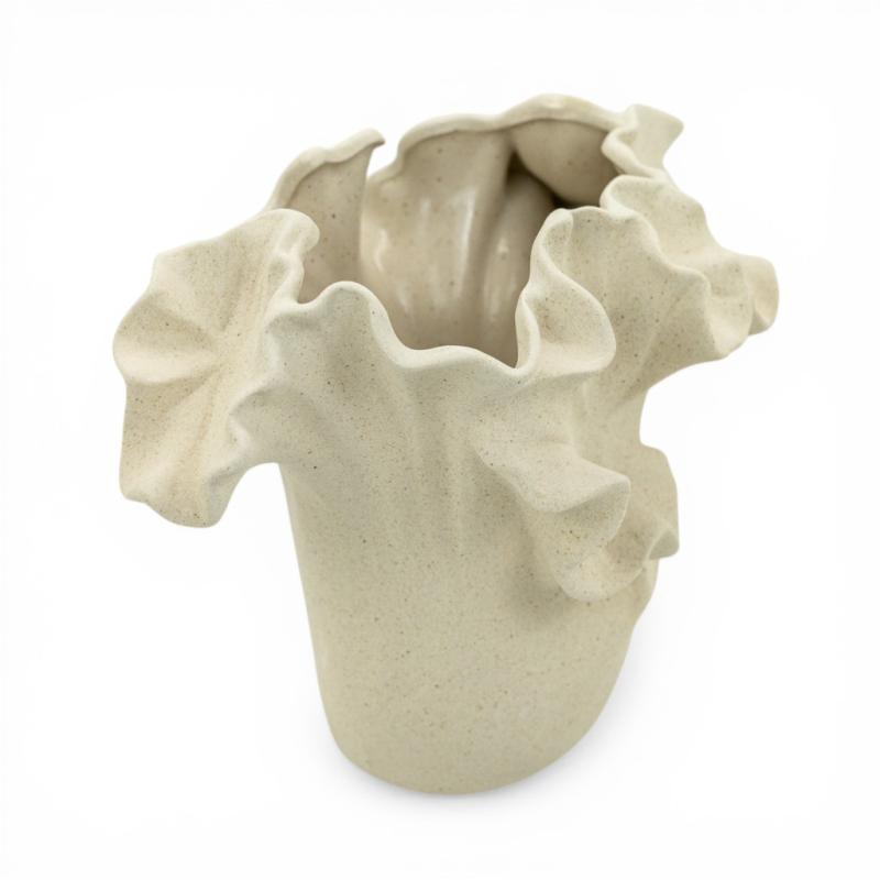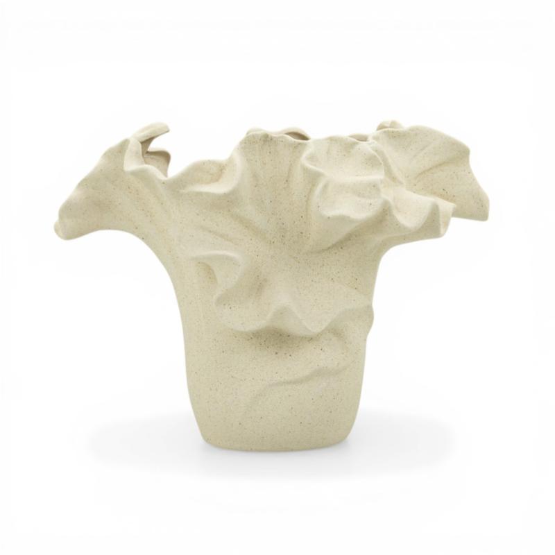 Керамічна ваза Floria відразу привертає увагу м'якою пластичною формою та хвилястим верхом, що нагадує пелюстки розкритої квітки. Ваза виготовлена з бісквітної кераміки - неглазурованого матеріалу з матовою поверхнею, яка відчувається пісочною, пористою та злегка шорсткою. Завдяки такій фактурі декоративна ваза має особливо природний вигляд, а кремовий відтінок підкреслює її теплий і затишний характер.