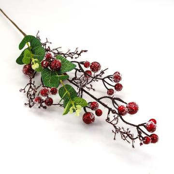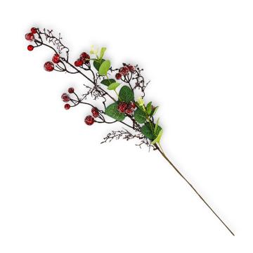 Гілка крижана з червоними ягодами (65 см) – стильний та святковий акцент для зимового декору. Яскраві ягоди з іскристим покриттям створюють ефект, ніби вони замерзли в кришталевому інею, а темні гілочки і свіже зелене листя додають композиції глибини та натуральності.