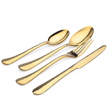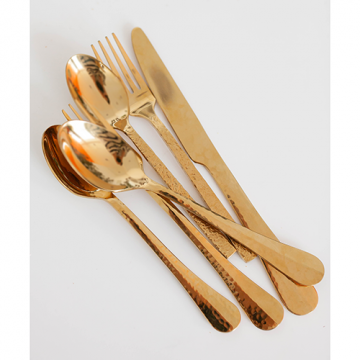 Колекція столових приладів виконана індійськими майстрами своєї справи. Кожен виріб унікально, завдяки ручній карбуванні з неповторним візерунком. Практично зібрати золотий набір приладів з ложок, виделки і ножа.